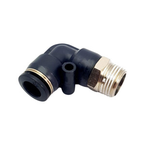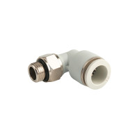 Фітинг пневматичний APL10-03 - кутовий пневматичний фітинг з зовнішньою різьбою з однієї сторони, та цангою з іншої. Ущільнення з корпусом здійснюється за допомогою гумового кільця, або конічної різьби. Варто зауважити, що цангова частина повертається незалежно від фіксації різьби в корпусі.