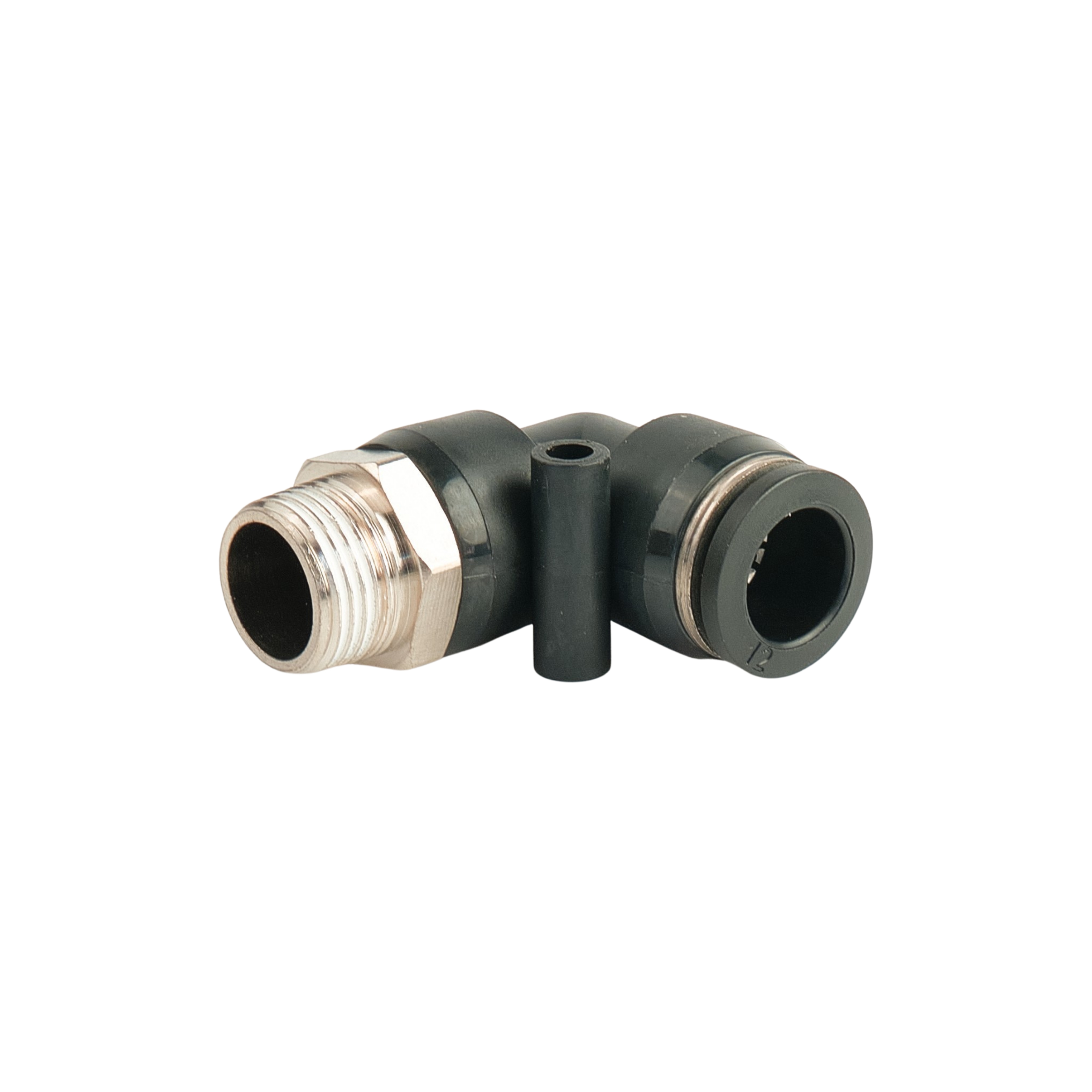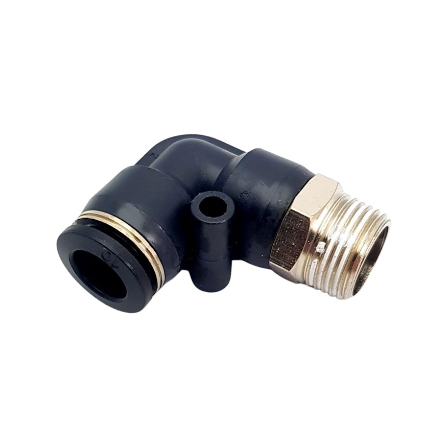 Фітинг пневматичний APL12-03 - кутовий пневматичний фітинг з зовнішньою різьбою з однієї сторони, та цангою з іншої. Ущільнення з корпусом здійснюється за допомогою гумового кільця, або конічної різьби. Варто зауважити, що цангова частина повертається незалежно від фіксації різьби в корпусі.