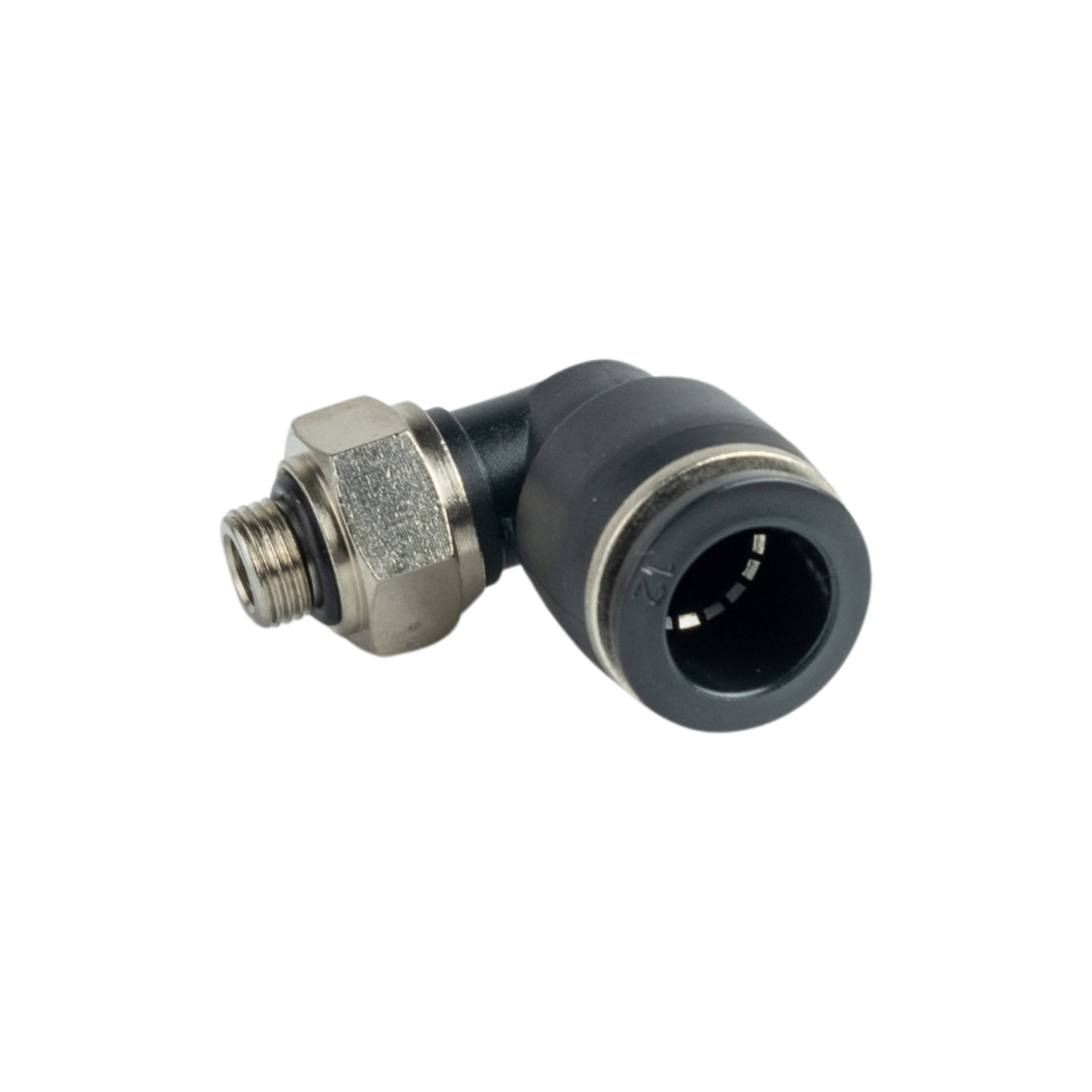 Фітинг пневматичний APL12-G01 - кутовий пневматичний фітинг з зовнішньою різьбою з однієї сторони, та цангою з іншої. Ущільнення з корпусом здійснюється за допомогою гумового кільця, або конічної різьби. Варто зауважити, що цангова частина повертається незалежно від фіксації різьби в корпусі.