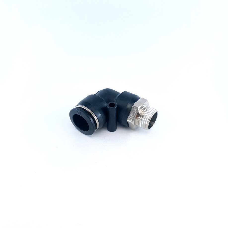 Фітинг пневматичний APL14-03 - кутовий пневматичний фітинг з зовнішньою різьбою з однієї сторони, та цангою з іншої. Ущільнення з корпусом здійснюється за допомогою гумового кільця, або конічної різьби. Варто зауважити, що цангова частина повертається незалежно від фіксації різьби в корпусі.