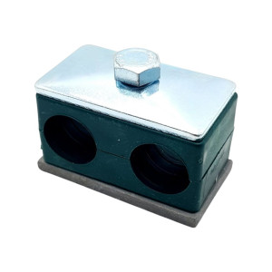 Кріплення труб Ду.22 Twin - - деталь для фіксації гідравлічних і пневматичних магістралей. Прижим складається з 5 деталей: нижньої стальної приварної пластини, двох пластикових зажимних колодок, верхньої нажимної пластини і болта, яким вся конструкція стягується.